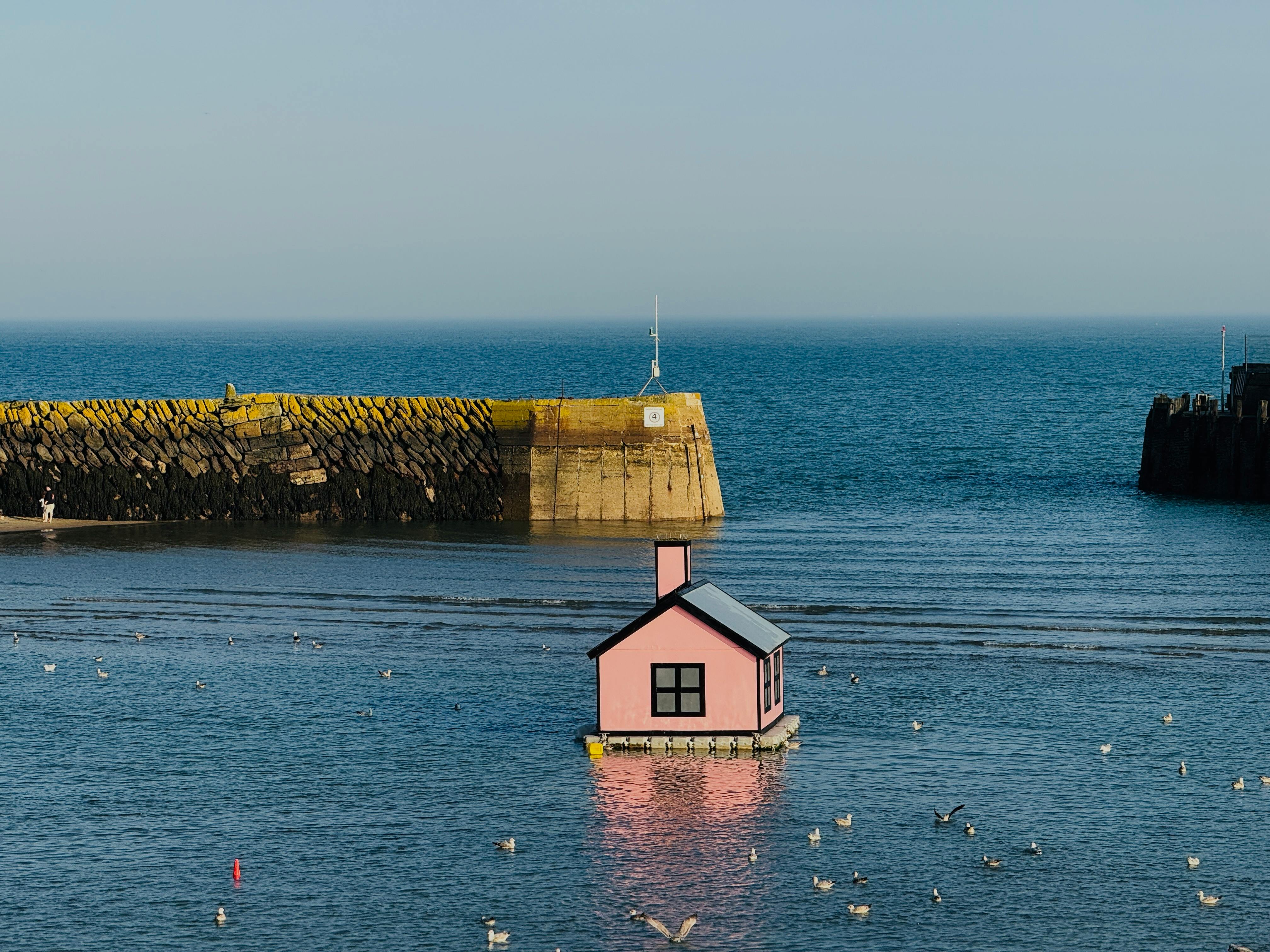 Tranquil ocean scene with boats anchored as swimmers enjoy the calm waters.
