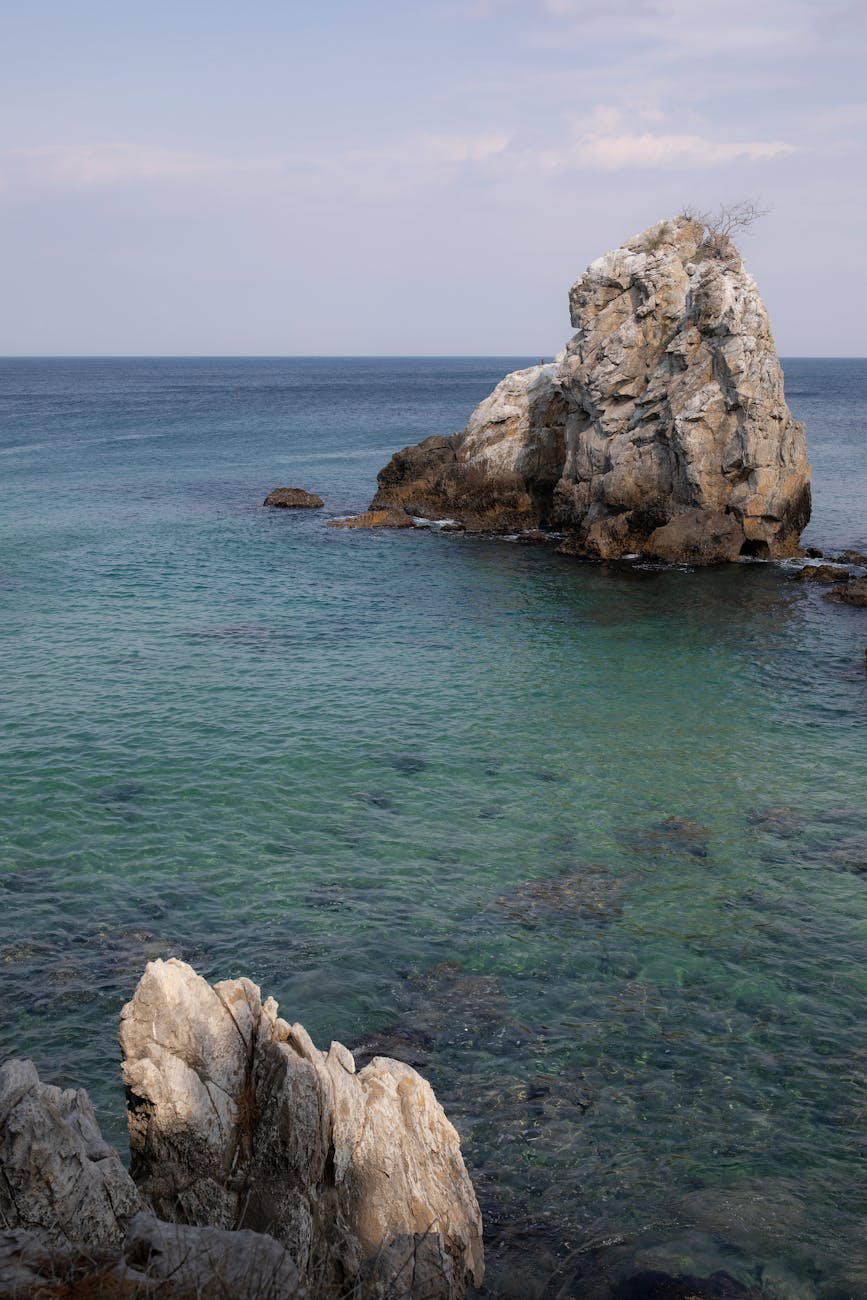 Peaceful beach scene with rocks, lush trees, and distant hills under blue sky.